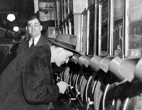 Consequently, the Funny House was a magnet for police attention. During one raid in 1943, inspector Edward Flanagan got a good look at the “evidence” as Funny House owner Angelo Gervaras stared into the camera, his face twisted in ironic wonder. Police confiscated 13 machines.