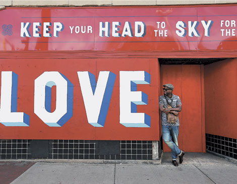 With live music, chalk art and people lined up around the block for CJ’s Famous Angus, the usually desolate Buckeye neighborhood feels like a cultural hub on this early fall Saturday. Everyone is here to celebrate the installation of the striking red, blue, yellow and white Love Lunes Over Buckeye mural that combines lune poetry — three-line 13-syllable haiku-style poems — with Adinkra symbols depicting West African adages. Poet Damien Ware wrote many of the poems, which convey positive messages such as “Let me help you with your heavy burden and baggage.” Ware collaborated with local high school students on others, including one for the final mural, which visual art firm Little Jacket and painter Alan Giberson created (above). We caught up with the 37-year-old Army veteran to chat about those Adinkra symbols and why he thought Buckeye needed some love.